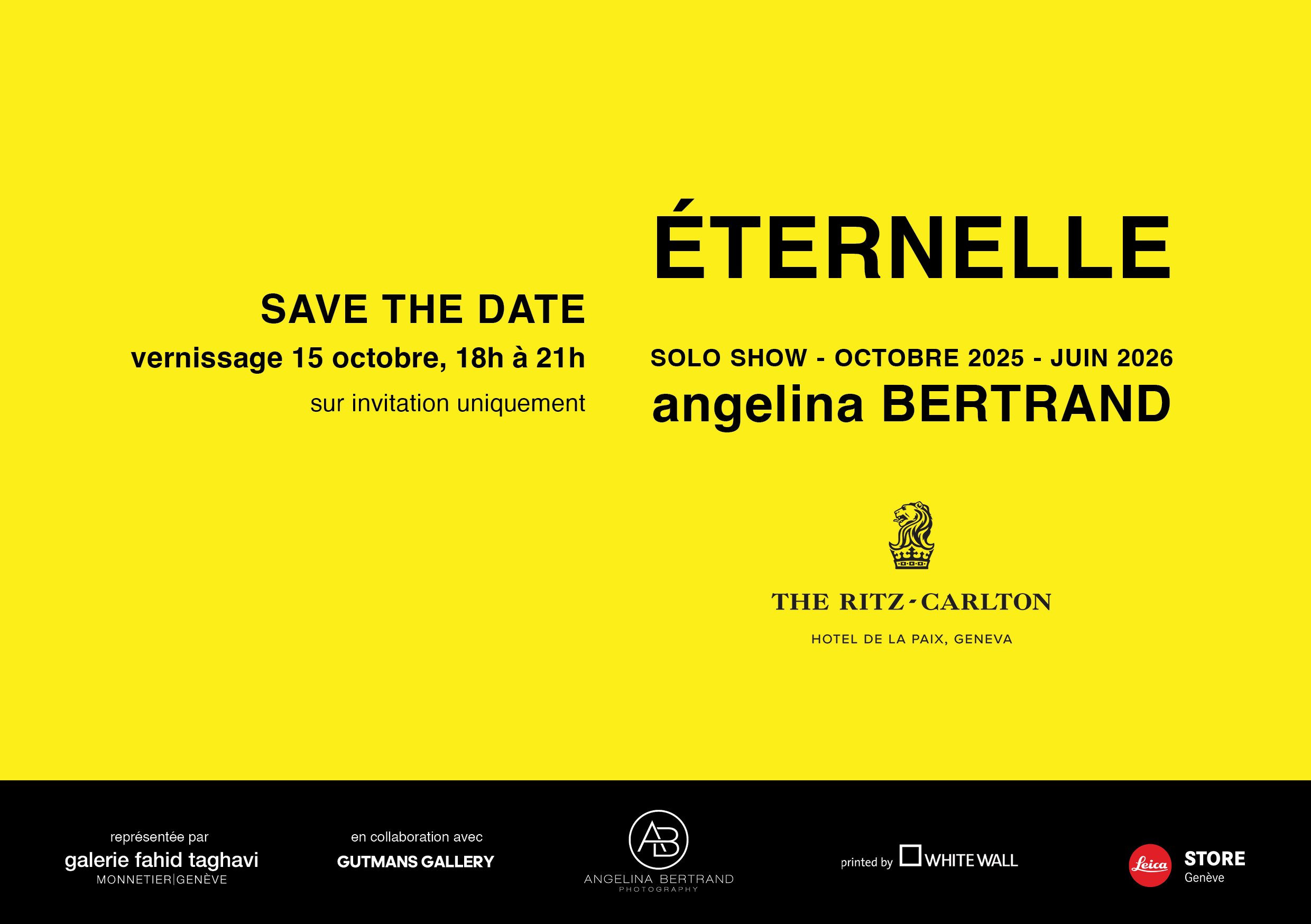 Nous avons le plaisir de vous inviter au vernissage hors-murs d’« ÉTERNELLE », une exposition de photographies proposée par Angelina BERTRAND, lors d’un cocktail dînatoire qui se tiendra au Ritz-Carlton – Hôtel de la Paix à Genève de 18:00 à 21:00.