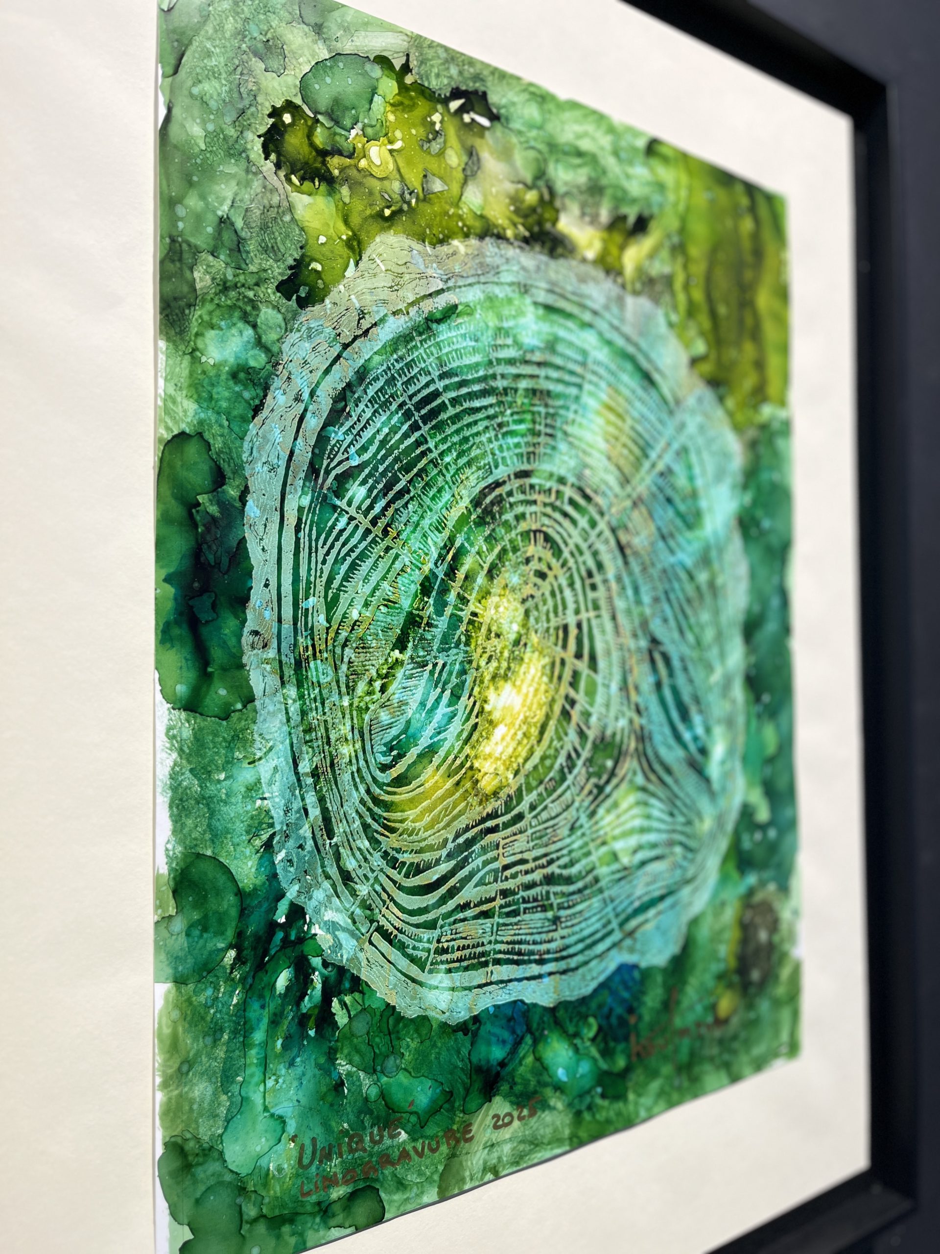 Serie : Unique Linogravure, technique mixte/papier. Pièce unique. Dimensions : 50 x 37 Encadrée : 72 x 57 x 3.5 cm