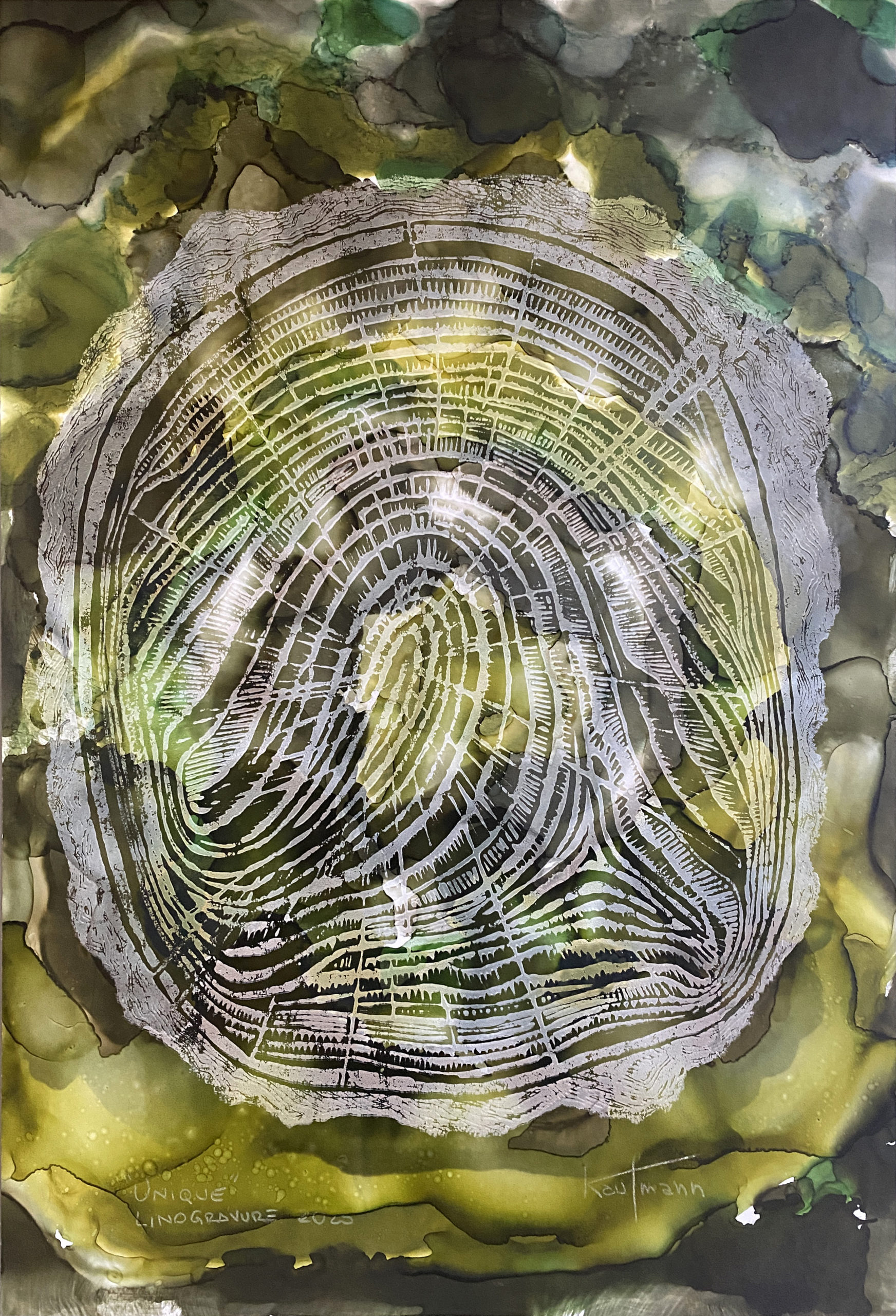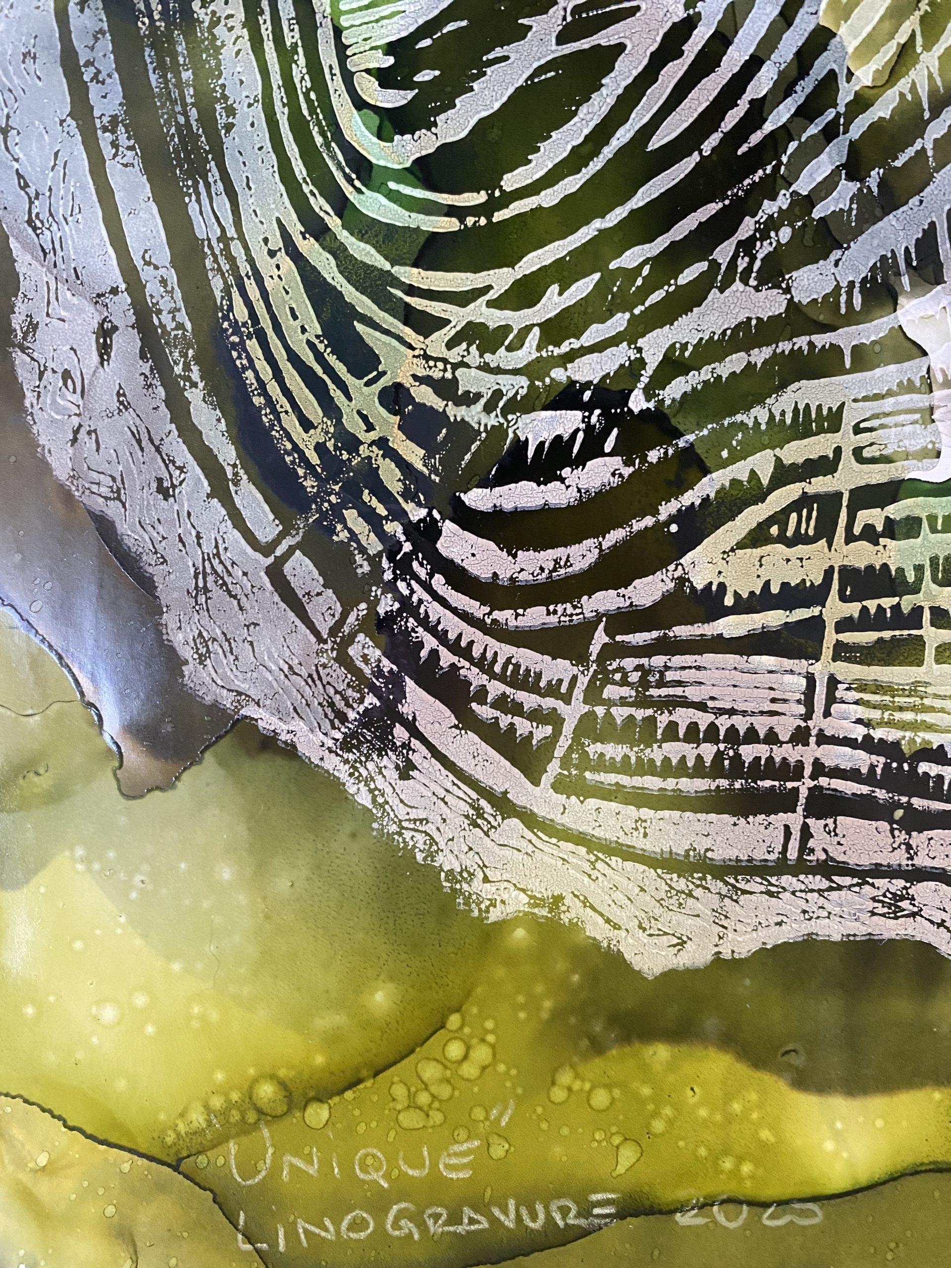 Serie : Unique Linogravure, technique mixte/papier. Pièce unique. Dimensions : 48 x 33 cm Encadrée : 72 x 57 x 3.5 cm